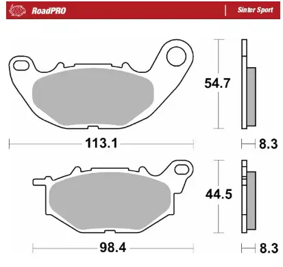 • Brake Pad RoadPro Sinter Sport, Yamaha, Front, Brake Pad 1 Length 113,1mm Width 54,7mm Thickness 8,3mm Brake Pad 2 Length 98,4mm Width 44,5mm Thickness 8,3mm