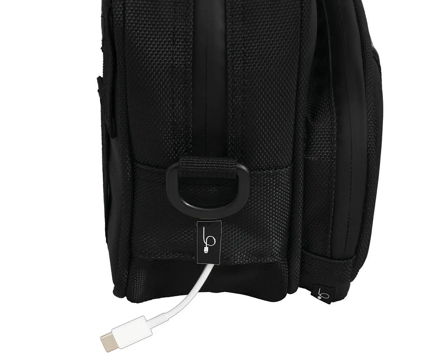 • Two charging cord slots for electronics.