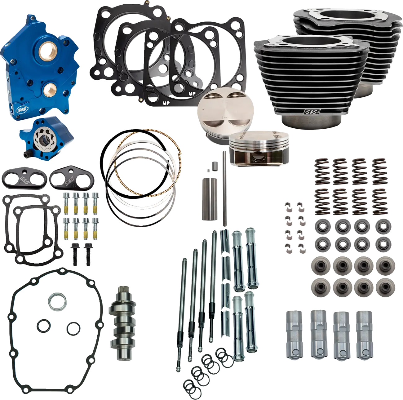 • Incluye bomba de aceite/placa de leva, varillas de empuje con cubiertas cromadas, taqués, casquillos de taqué, árbol de levas S&S 550 y resortes de válvula