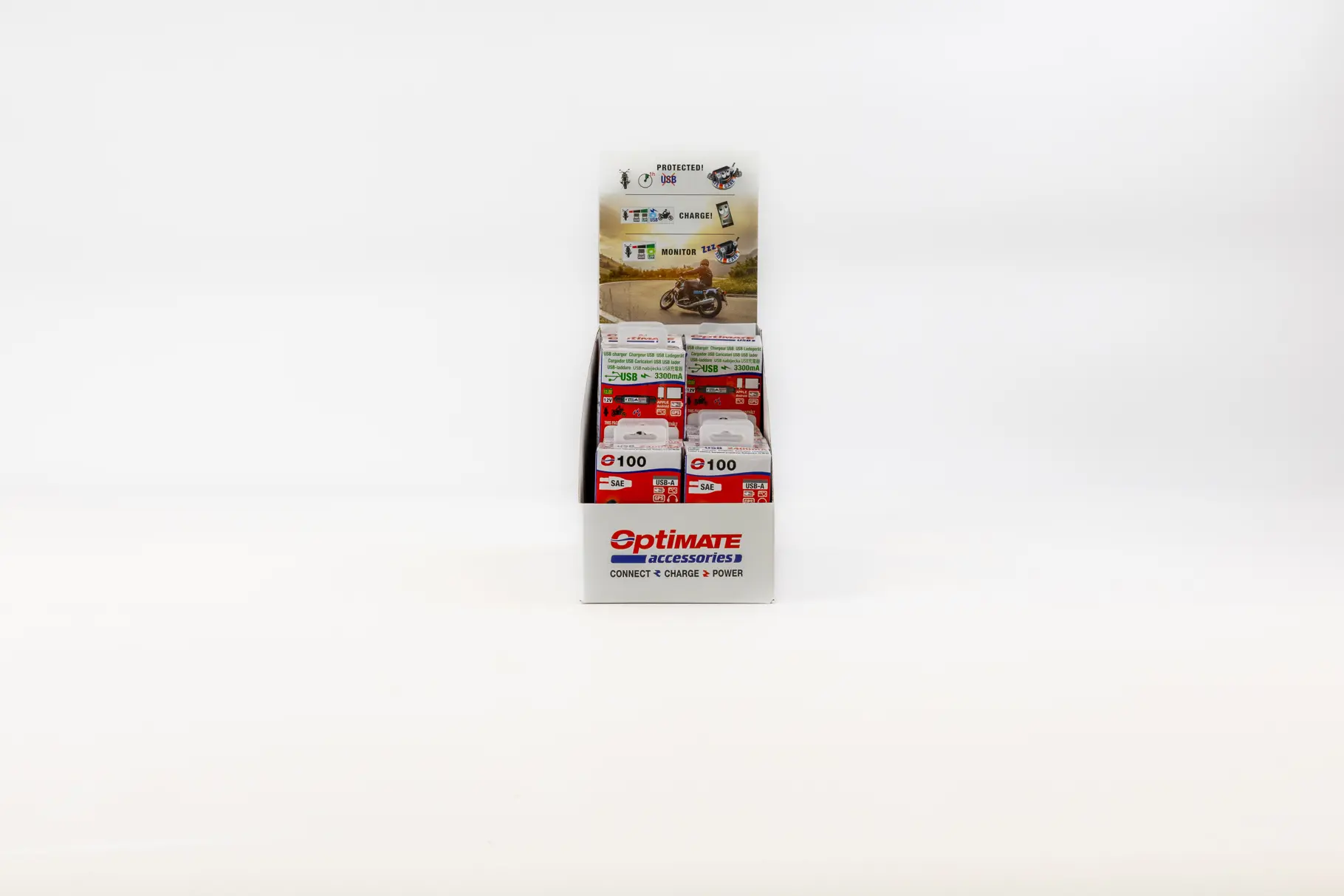 • 3x O-100 : Chargeur SAE vers USB portable et compact pour une charge sûre et rapide de tout appareil USB, y compris téléphone, caméra ou GPS.