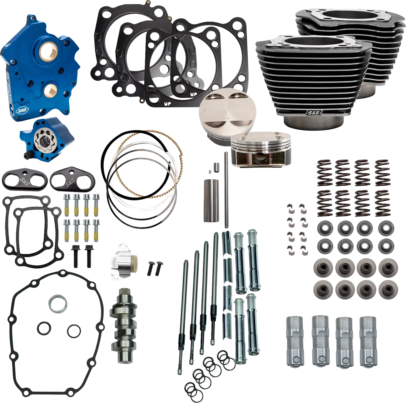 • Include pompa olio/piastra camme, aste di spinta con coperture cromate, punterie, boccole punterie, albero a camme S&S 550 e molle valvole